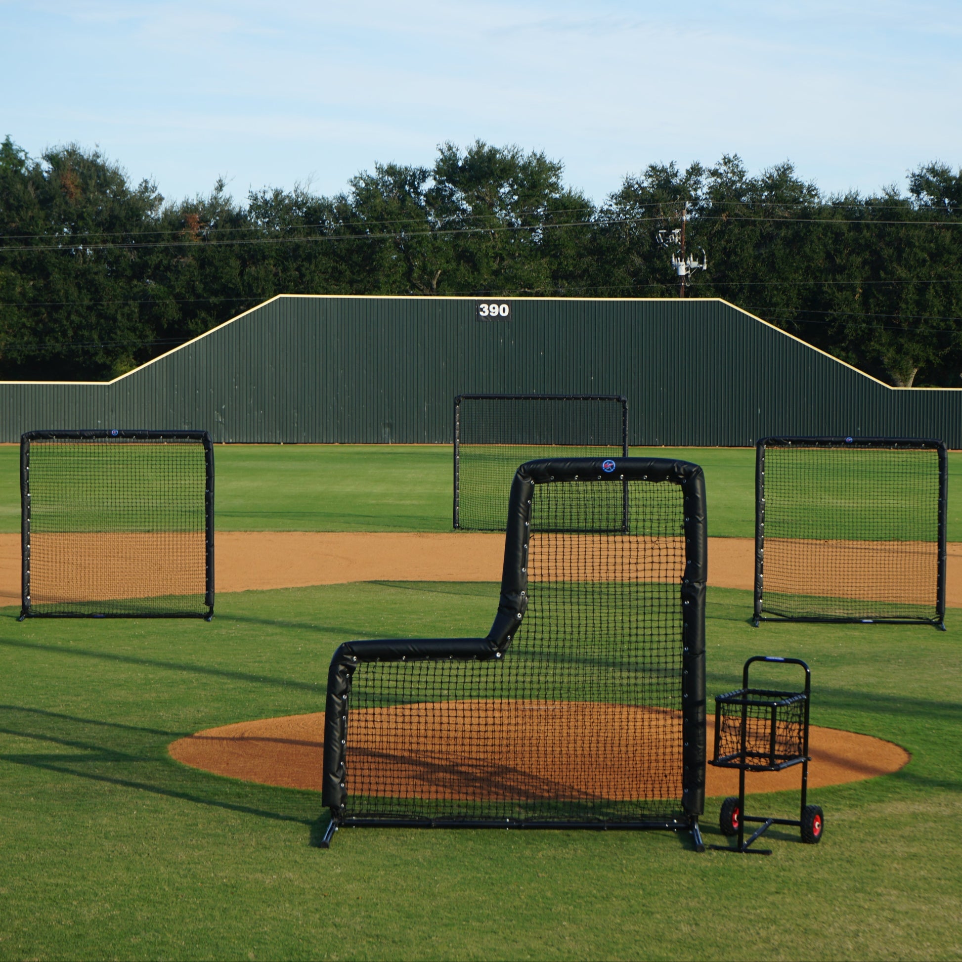 Equip your field with our brand new BP Pro Package! You are given a batting practice L-Screen, first and third base field screens, a behind second base field screen, and a ball cart. Please call for a different variety of screens and ball carts, such as the picture shows. This package includes: